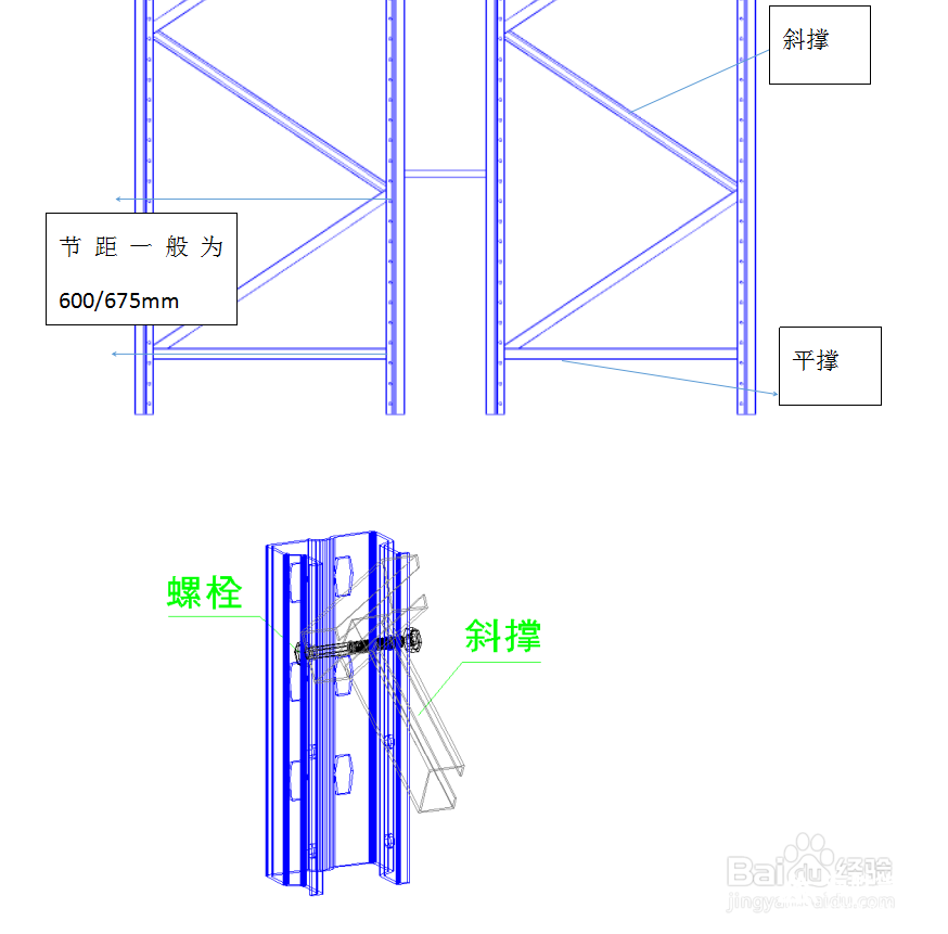 平撐跟斜撐的連接方式就如同上圖所示。備注:立柱上的圓孔間隔為75mm,斜撐節(jié)距通常為600/675mm,也就是說相隔7個(gè)或者8個(gè)孔距。具體間隔多少,需要自行計(jì)算。